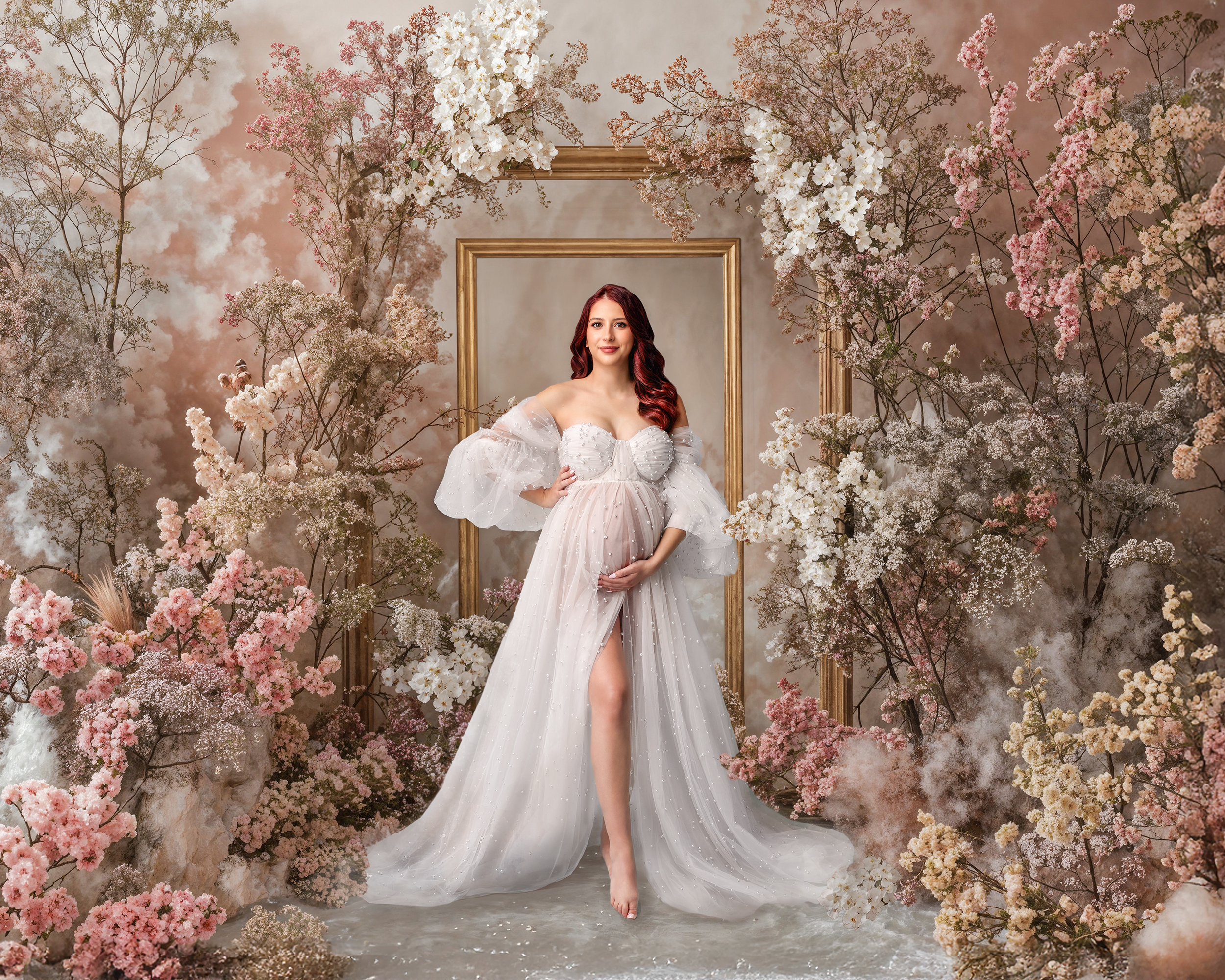 Although outside pregnancy shots are somewhat common, a studio session offers certain advantages. Managed Environment There is no weather concern; strong sunlight, heat or wind damaging your outfit or hair. Professional lighting accentuates your natural beauty using pleasing, sculpted light. For a high-end style, my studio carries designer maternity gowns, silks, and accessories for the luxury wardrobe. We offer a comfortable environment, air conditioning, heating and a spacious lounge to relax in between photos.